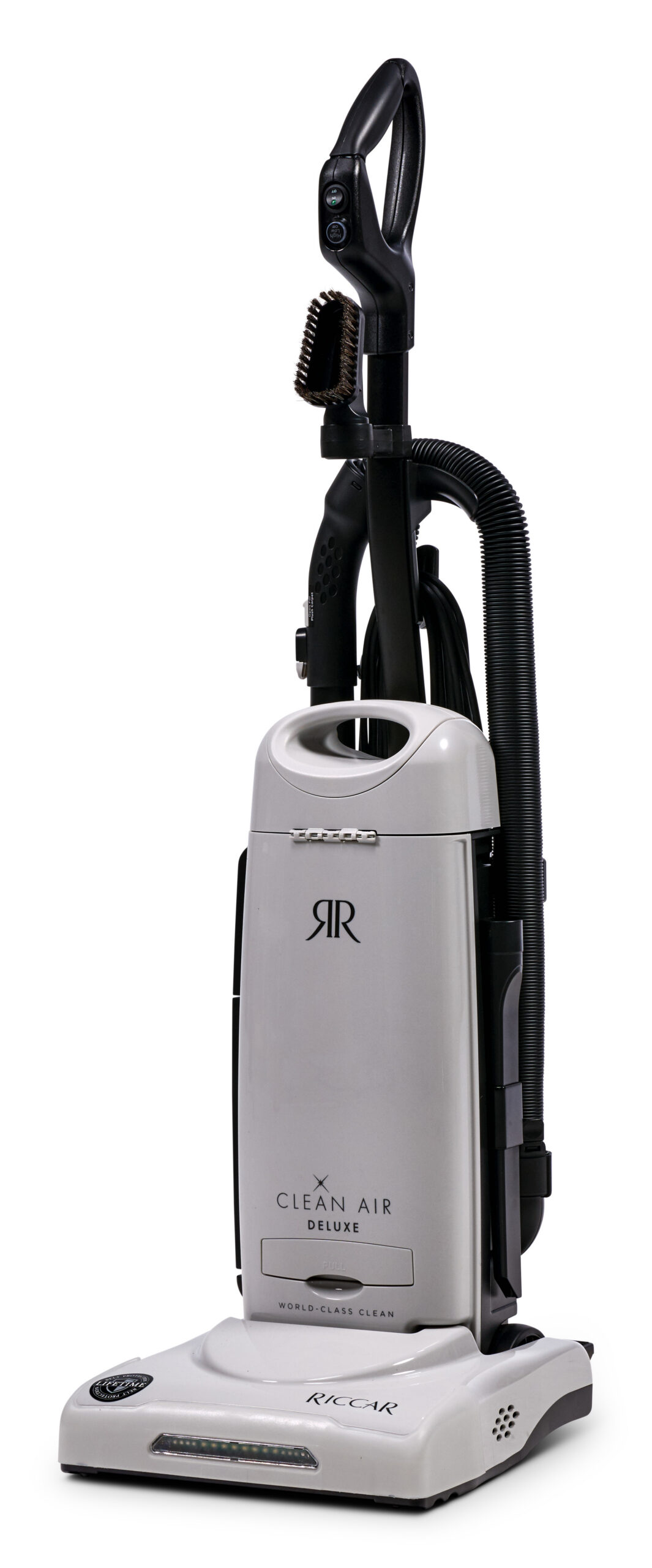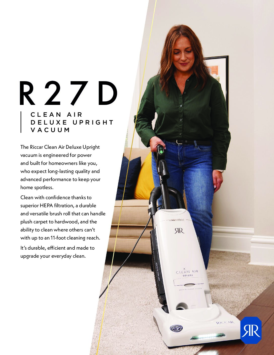 New from Riccar, the R27 Deluxe is an advanced cleaning machine, built for power, performance and ease of use. The R27D model has a self-adjusting nozzle that transitions beautifully from ultra-plush carpet to bare floors without scratching wood or blowing dust. Large rubber wheels, plus 360-degree casters and smaller rubber wheels mean the vacuum turns on a dime. Lower it to the floor for cleaning under furnishings easily, or stretch it a full 11 feet to clean crevices you never thought you’d reach with an upright vacuum.